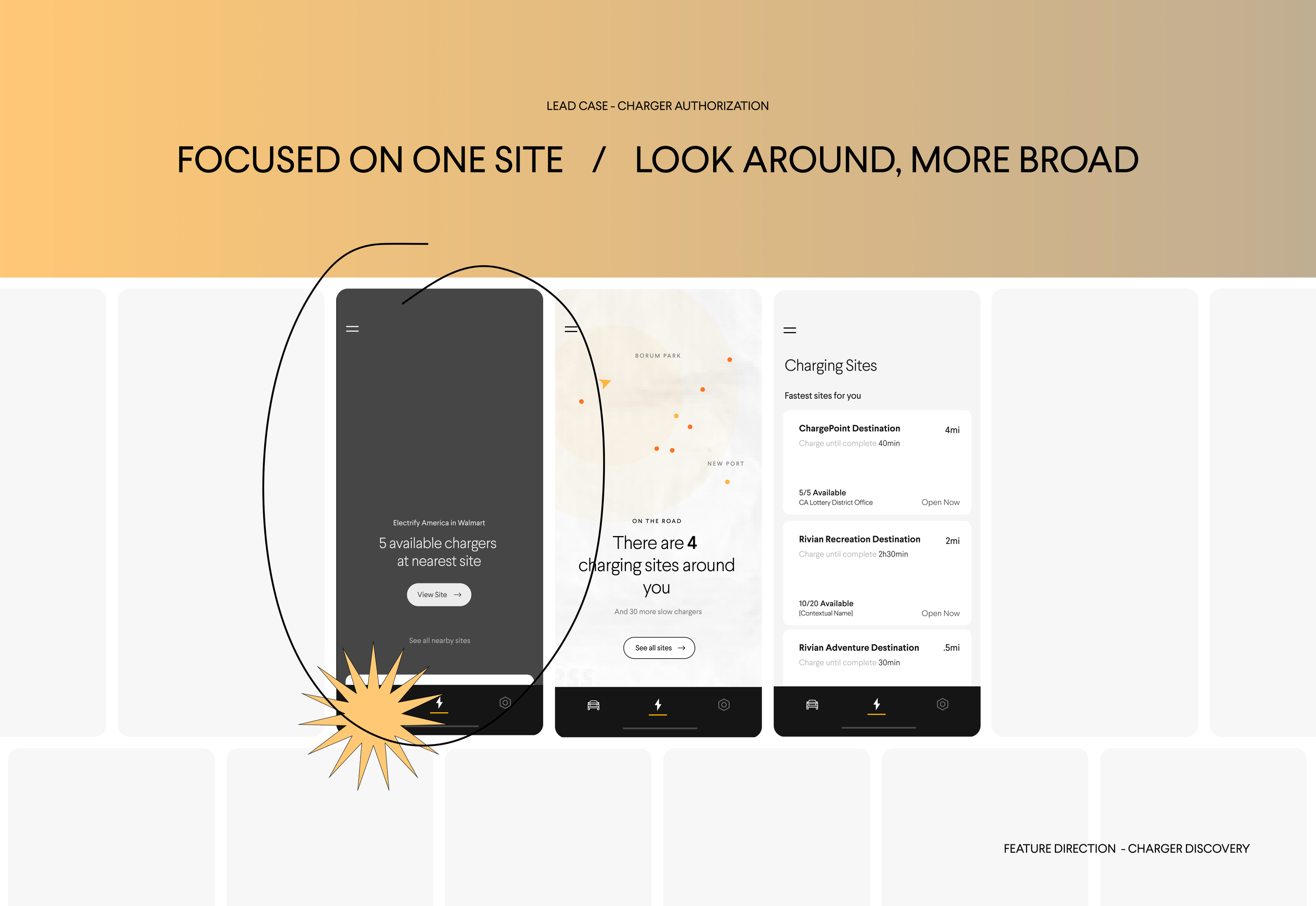 We landed with the hyper-foced ux show casing the nearest site as most users would come to the app post navigating with their vehicle with the need to initiate a session, but they would also have the ability to keep exploring as the secondary case.